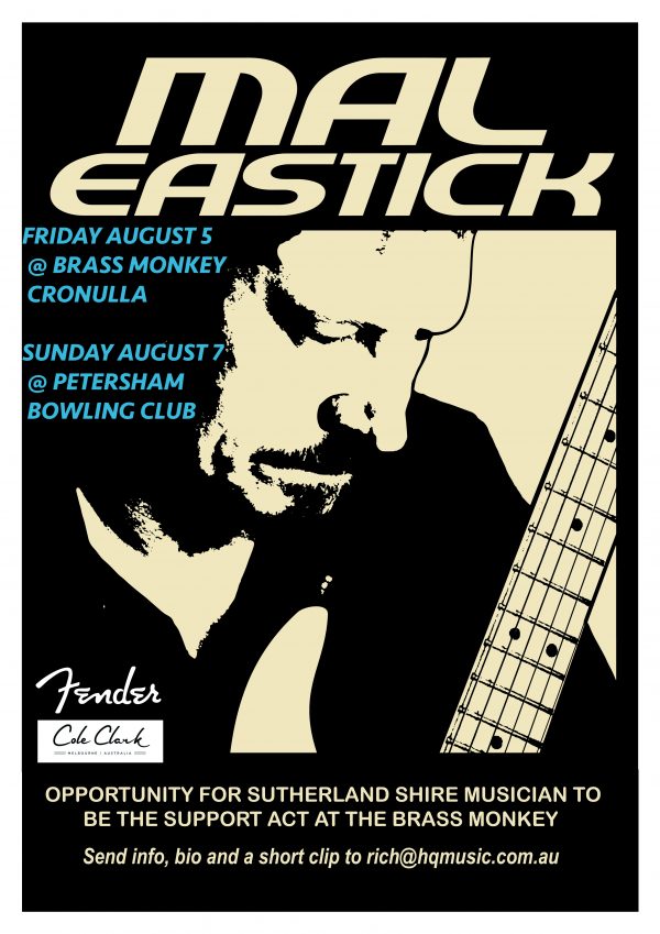 Mal Eastick is widely considered to be Australia’s finest electric Blues guitarist, with a passionate, explosive and soulful style that has been featured with many leading International and Australian acts for over 40 years. He has played with the likes of Robert Cray, Los Lobos, Buddy Guy, George Thorogood & The Destroyers, Johnnie Johnson, Joe Walsh, Junior Wells, Eric Burdon & The Animals, Tommy Emmanuel, Jimmy Barnes, Kevin Borich, and many more.